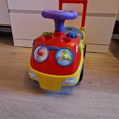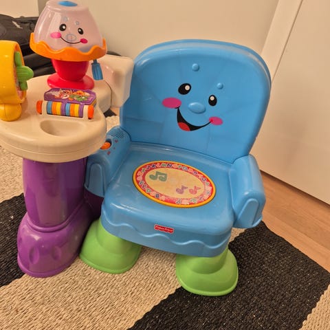 Fisher-Price barneløper med musikkfunksjon, håndtak for støtte, og fargerik design med rød, gul og blå farge. Egnet for små barn som lærer å gå og utforske.