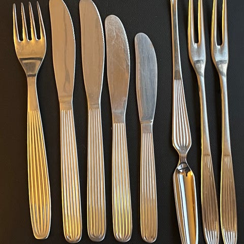 Fire kniver, serveringsgaffel og serveringsskje fra Hackman selges enkeltvis eller samlet. Skaft i stål, hvitt håndtak i hardplast. Bruksmerker, men fortsatt fint. Kniv 21 cm, gaffel 20 cm, serveringsbestikk 23 cm