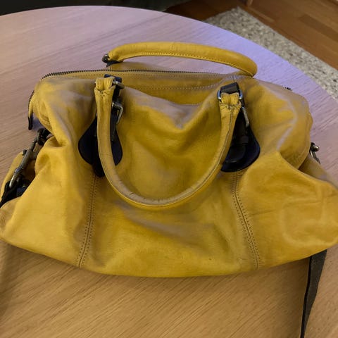 Vintage brun håndveske i imitert krokodille mønster. Et rom i midten som kan lukkes, to utvendig åpne rom, et på hver side. Rommet i midten har en innvendig lomme med glidelås, og en uten. Veldig pent brukt, men er litt slitt under, og søm ved den ene hanken har løsnet. Se detaljebildene.