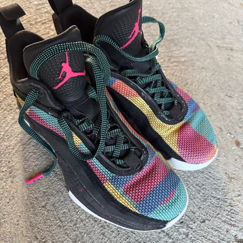New Balance Kawhi Signature basketballsko i størrelse 42 ,5 EU. Skoene har en svart og hvit fargekombinasjon og er designet for bruk innen basketball. Materialene og konstruksjonen er tilpasset for å gi støtte og komfort under aktivitet.