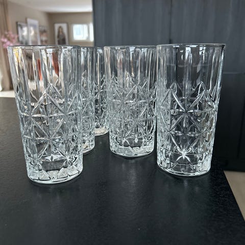 Bodum French Press kaffebrygger med tilhørende glasskopper. Kaffebryggeren har et håndtak i plast og en metallramme rundt glasskolben. Settet inkluderer fem glasskopper som tåler varm drikke