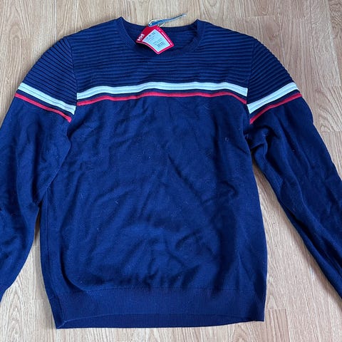 Dette er en hettegenser i størrelse M. Genseren er lite brukt, men har noen nupper, som er ubetydelig.Den har kabelstrikkede detaljer på ermene og ribbestrikket hals.