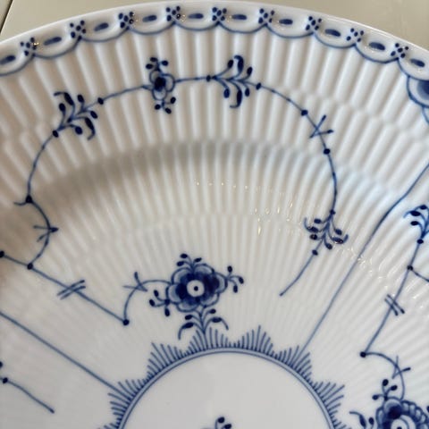 Royal Copenhagen tallerken med dekorativt blått og rødt mønster. Tallerkenen er laget av porselen og egnet for daglig bruk i kjøkkenet.