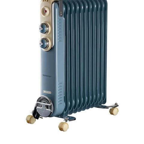 Oljefylt radiatorovn med flere varmeelementer, hvit farge og innebygd termostat. 2000w. Passer til oppvarming av rom i hjemmet eller kontoret.