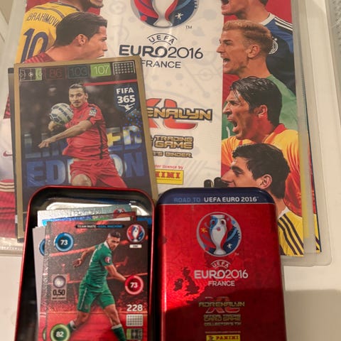 UEFA Euro 2016 samleobjekter med fotballspillere Zlatan Ibrahimović og Stephan Lichtsteiner. Kortene viser spillernes bilde, navn, lag og ulike statistikker knyttet til fotballspillet.