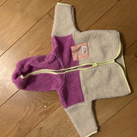 Cubus ytterjakke med fleecefor og lukking i siden. Hette som er festet med knapper. Rosa og oransje.