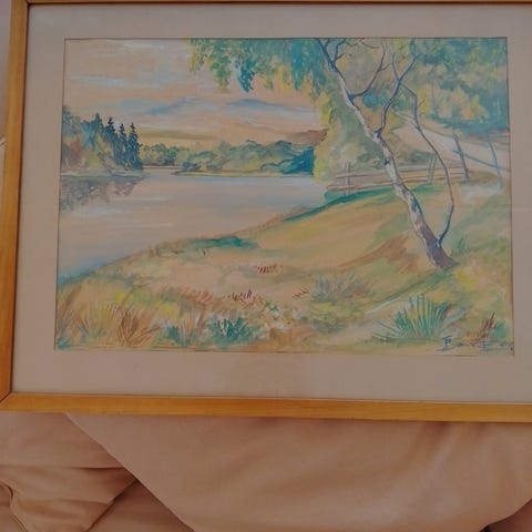 Maleriet er plassert i en ramme med passepartout og glass fra Bærum Glas. Passer til dekorasjon i hjem eller kontor.
