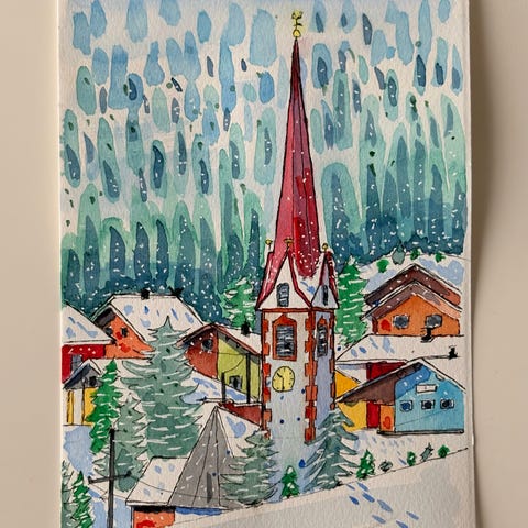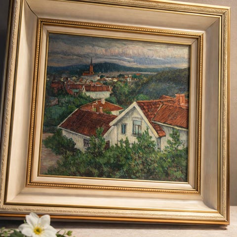 Innrammet akvarellmaleri Bymotiv