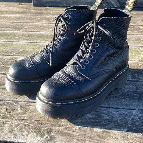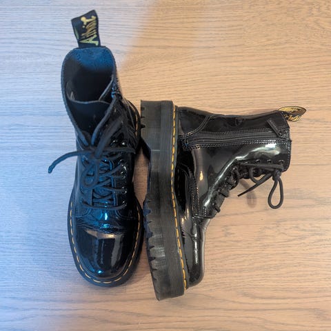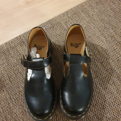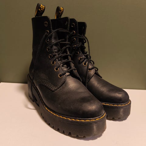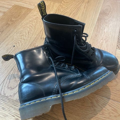 Dr. Martens støvler i størrelse 38. Støvlene er laget av svart skinn og har snøring.