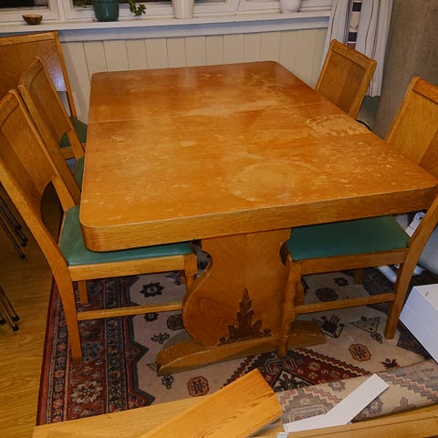 Godt brukt med 4 stoler og 3 illegsplater ca 30 cm stk.