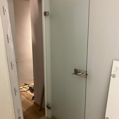 Selges fordi vi byttet ut innerdører mellom hus og hybler med leilighetsdører. Dørene ble installert i et nybygg, og har ikke rukket å være oppe i mange ukene før de ble byttet ut. Det er satt på dørstopper på håndtak som medfølger om ønskelig.