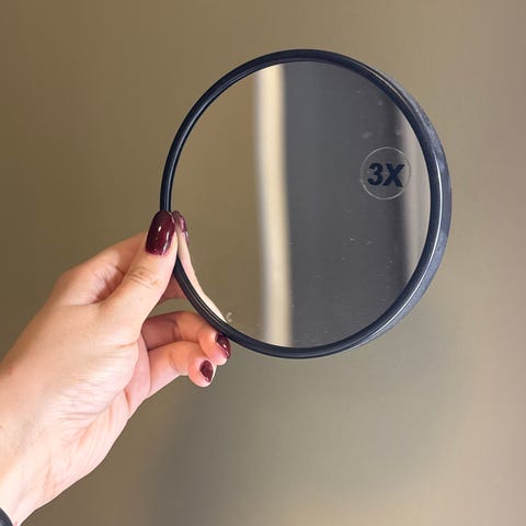 Milluminate X dekorasjonsspeil med 5x forstørrelse. Speilet har en rund form og er designet for detaljert bruk, som sminke eller barbering. Passer for personlig pleie og dekorative formål.