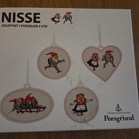 Selger et sett med 4 ulike julepynt fra Porsgrund med motiv fra nisseservise.