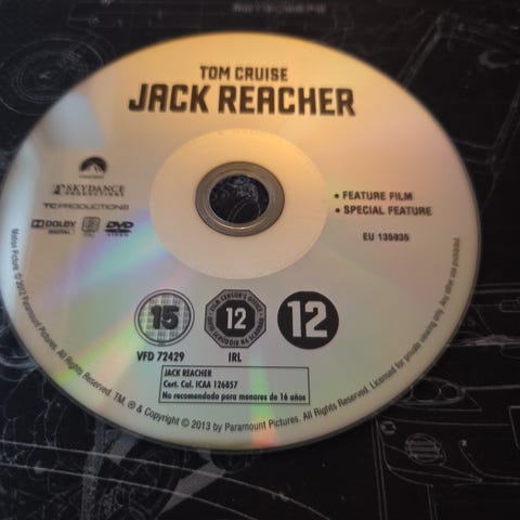 Jack Reacher DVD film. Aldersgrense 15 år. Inneholder action og thriller.