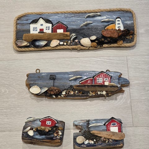 Siri Design Velkommen dekorasjon laget i tre med maritimt motiv. Dekorasjonen viser små hus, fugler og skjell, og har en tekst som sier "Velkommen". Passer til oppheng på vegg som en velkomsthilsen. Størrelse 42x20 cm og tykkelse ca 4 cm.