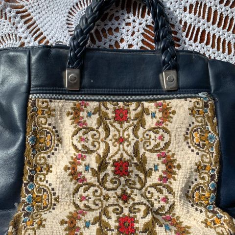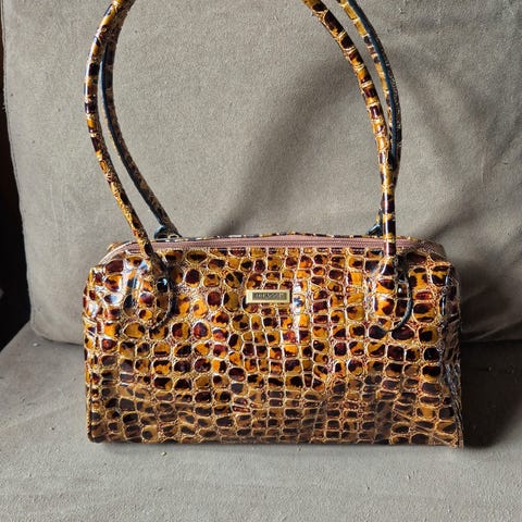 Lakkveske Fiorelli. Fin med metall detaljer og kort stropp.vesken har glidelås å toppen. Det er ett stort rom og et lite med glidelås. Kan brukes som clutch også. Vesken er ca 28 cm bred på toppen og ca 36,5 cm i bunnen. Vesken er ca 17 cm høy utvendig. Innvendig høyde fra bunnen til glidelås ca 13 cm.