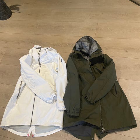Veldig lite brukt jakke fra Didrikson med justerbar og avtagbar hette, ytter-og-innerlommer, justerbar i livet, og både glidelås og knapper foran. Veldig behagelig og brukbar i alle sesonger ettersom hva man har på innenfor.