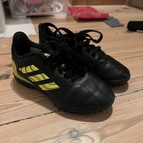 Adidas fotballsko i svart farge, størrelse 30 1/2. Skoene har en slett overflate for ballfølelse, snøring foran og små knotter på yttersålen for grusbaner. Materialet er syntetisk.