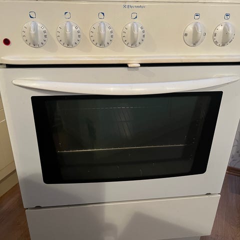Zanussi komfyr med fire kokeplater og integrert ovn. Komfyren har manuelle knotter for temperaturkontroll og en hvit farge. Egnet for matlaging og baking i hjemmet.