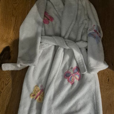 Morgenkåpe hvit med tynne beige striper, hvit frotté innvendig, 80 cm lang