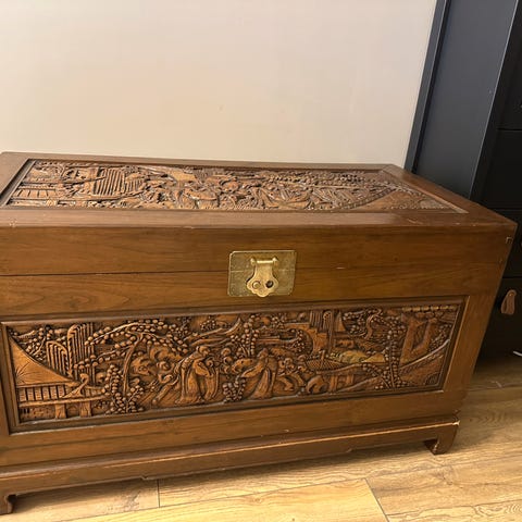 Håndskåret kiste laget av tre med detaljerte dekorasjoner på alle sider. Kisten har en lås i metall og står på fire ben. Er laget i kamfertre, med kinesiske detaljer. Det er en liten sprekk i motivet på toppen (se bildet) og en liten sprekk i bunnen (se bilde).