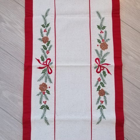 Fargene er hovedsakelig blå, rød og hvit. Passer til juledekorasjon i hjemmet.