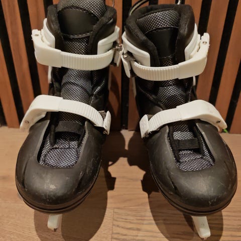Ishockeyskøyter for barn i størrelse 34 (justerbar størrelse fra 32-34). Skøytene har blå og svarte farger med justerbare stropper for god passform. Passer for ishockeybruk.