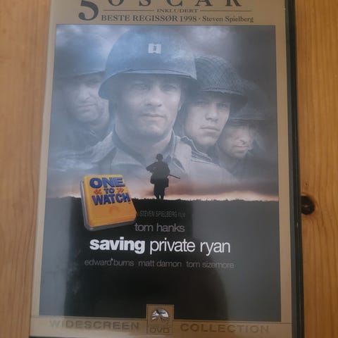 DVD-utgave av filmen Saving Private Ryan med Tom Hanks. Inneholder filmen i standardformat. Passer for film- og historieinteresserte.