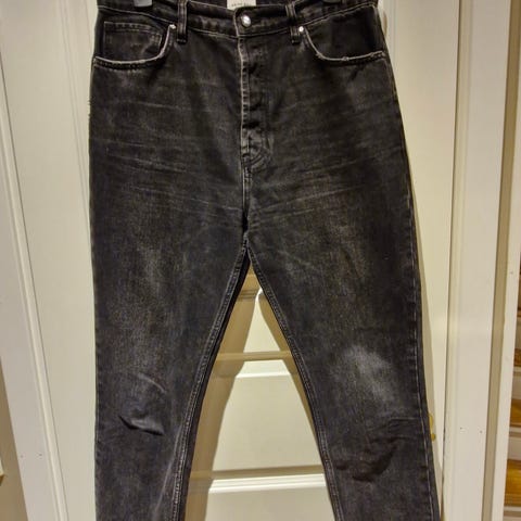 Pent brukt denim bukse selges dessverre pga endret størrelse. Blå med litt slitt uttrykk på lommekantene og nederst på buksen. Knapper som lukker buksen. To lommer foran og to bak. Litt vid og cropped modell.
