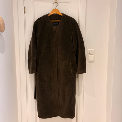Filippa K Alexa kåpe i størrelse 42. Ubrukt, feil størrelse. Lapp er på. Nydelig kåpe av ull. Fargen på kåpen heter «Moss Grey»