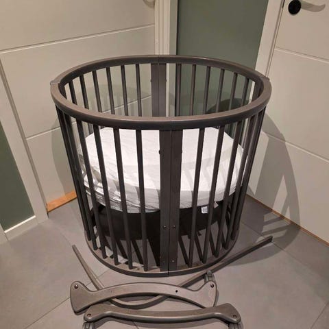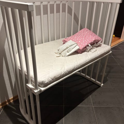 Hjul med låsefunksjon. Madrasse følger med. Noen bruksmerker men ellers fin og i god stand. Dyne og dynetrekk i str 65x80 kan medfølge