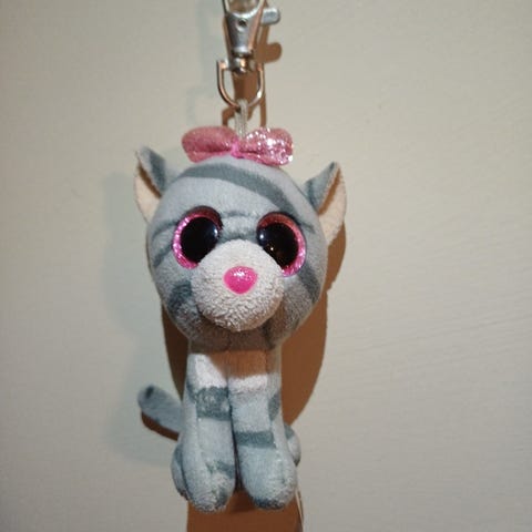 Største Ty kosedyr, formet som en katt med grått og hvitt stripete mønster. Har store, runde øyne med rosa detaljer. Laget for barn som lek eller samling.