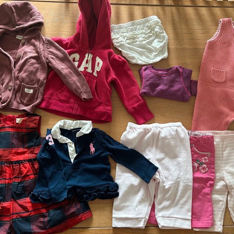 40 plagg. Noe i str 74 (da store i str) og klær opp til str 92. Noen plagg aldri brukt, noe veldig pent brukt og noe godt brukt. (Flekker kan forekomme) fint til ekstra skift i bhg. Pakken inneholder: