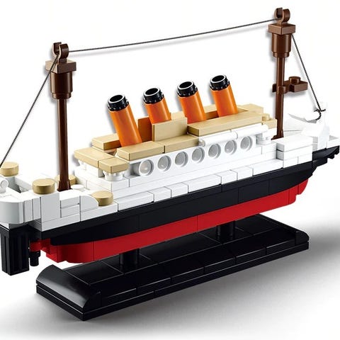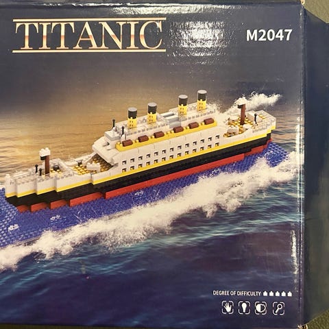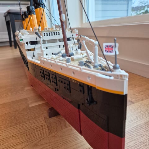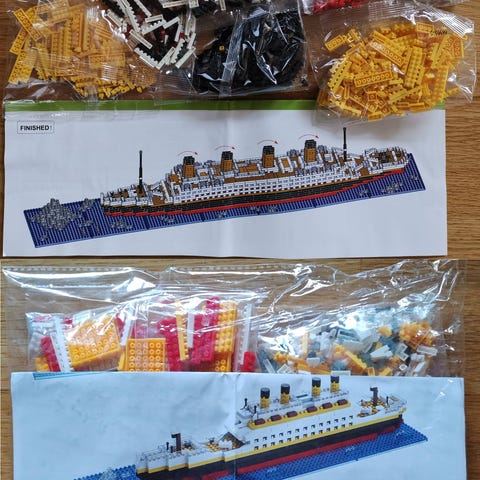 Titanic modellskip, tror det heter Cobi (ikke LEGO). Modellen viser detaljer som skorsteiner, dekk og flagg, og er designet for visning eller samling. Ikke helt komplett, tipper det mangler noen deler. Iver på 8 år som selger 😊