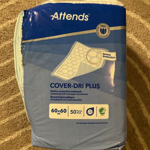 Attends Cover-Dri Plus engangsbeskyttelse med målene 2 x 80x170 cm + 3 x 80/90 cm. Produktet er laget for å gi sikker beskyttelse mot væske og fuktighet. Passer til bruk i situasjoner hvor ekstra beskyttelse er nødvendig, som for eksempel ved pleie eller medisinske behov.