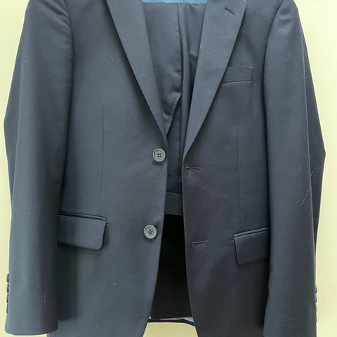 Mørkeblå slimfit dress fra Dressmann. Jakke str 46 bukse str 31-32.
