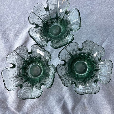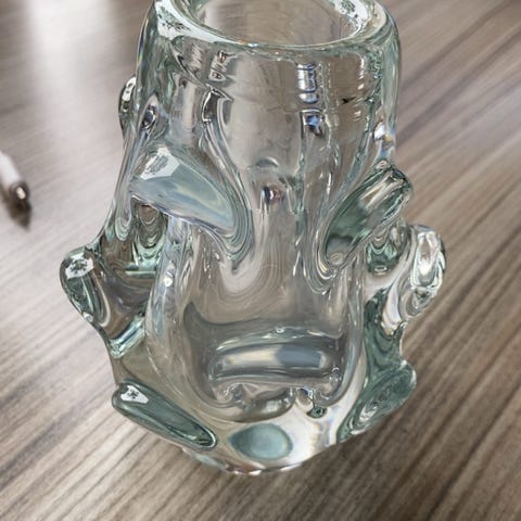 Stilig 60-talls design, 1 firkantet og 1 rund. Kr 100,- pr stk. Begge er 13,5 cm høy. Massivt glass, tunge.