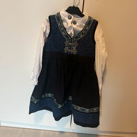 Festdrakt i ull med hvit skjortebody og strømpebukse. Passer 86-92.