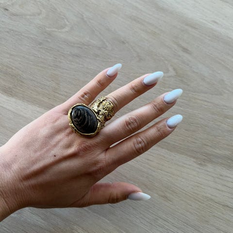 Sjekk gjerne profilen min – jeg har flere (og legger av og til ut nye) one of a kind smykker laget av edelsteiner og natursteiner som jade (jade), onyx (onyks), agate (agat), red carnelian (rød karneol), topaz (topas), amazonite (amazonitt), turquoise (turkis), lapis lazuli (lapis lazuli), quartz (kvarts) og chalcedony (kalsedon). Minner om Mary fra Lié studio, Lie studio, Anni lu, tarinii, sophie buhai, sophie bille bahe, og i samme stil som cos, old Céline, Jil Sander, Arket, Totême, toteme, Celine, tibi ganni Marant arket éesome xs s m l