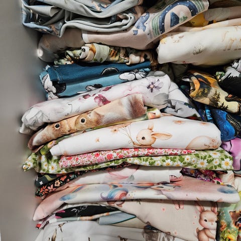 Stoffpakke selges samlet. Noen av stoffene er ikke klippet i, andre er det klippet litt i.