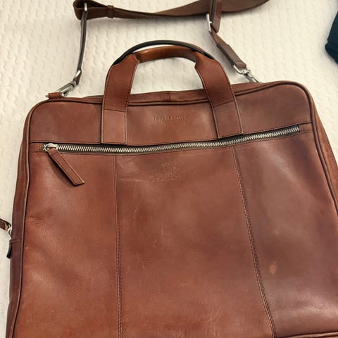 Vesken er pent brukt og fullt funksjonell. Den har synlige, men moderate bruksspor i skinnet – helt normalt for kuskinn og gir et mer levende uttrykk. Ingen hull, rifter eller defekte glidelåser.