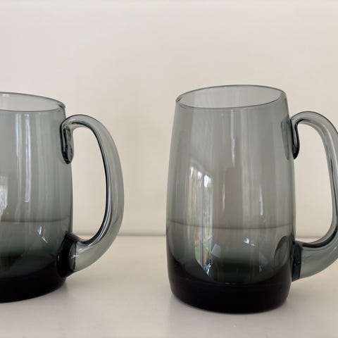 Hadeland Glassverk ølkrus laget av sotet glass. Krusene har hank.