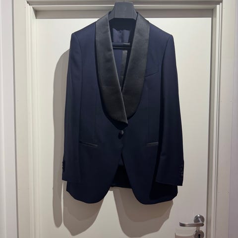 Klassisk pen smoking fra Morris Heritage. Den er vevet i 100% ull og jakken kommer med peak lapel slag. Egner seg i alle anledninger der smoking kreves. Jakken har svarte silkebelagte knapper samt svarte silkeslag og kommer med dobbel splitt bak i rygg. Mike trousers følger med. Jakken er i