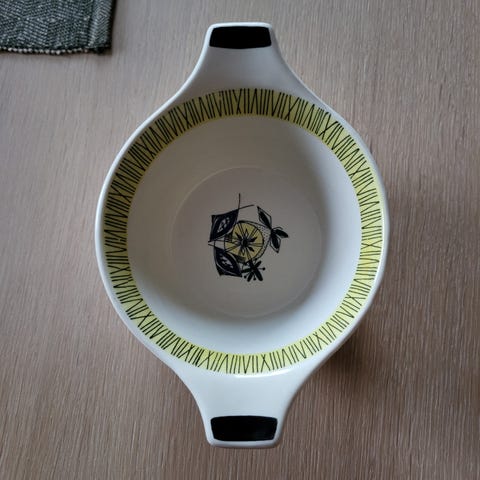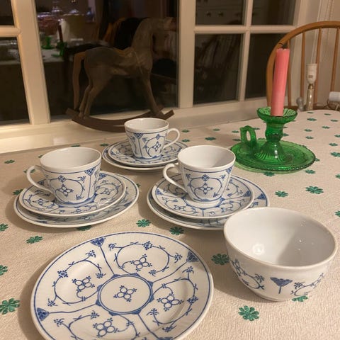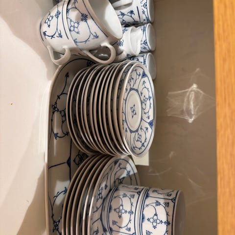 Porsgrunn hvitt med rød kant. 12 stk middagstallerkener (25/20 cm) og 8 suppeskåler 20/15 cm. I tillegg 1 stk servering skål 23/19 cm h:7 cm, og saus mugge h: 11 cm. Ingen skader, men ser litt at det er brukt. Må avtale henting, eventuelt levering hvis i nærheten.