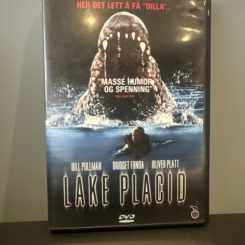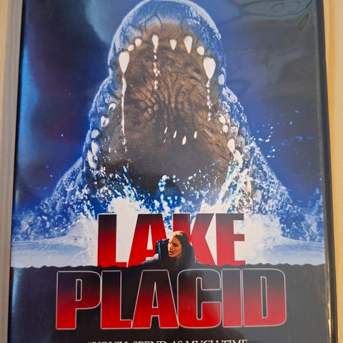 filmen Lake Placid med temaet masse humor og spenning. Coveret viser et bilde av et stort krokodillehode med åpne kjever og personer i vannet foran. Inkluderer navnene Bill Pullman, Bridget Fonda og Oliver Platt.