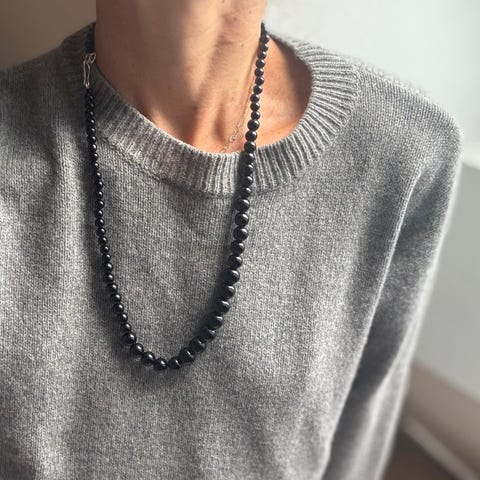 Smykke laget av blankpolerte svart agate perler i ulike størrelser, 14k gullbelagt lås . Lengde ca. 42cm.