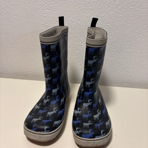 Gummistøvler i størrelse 25. Støvlene er blå med mønster og har såle i kontrastfarge. Unisex-modell som passer både gutter og jenter. Laget i vanntett materiale som egner seg til bruk i regnvær og vått underlag. Sålen har mønster for bedre grep på glatte underlag. Fra et røyk og dyrefritt hjem.