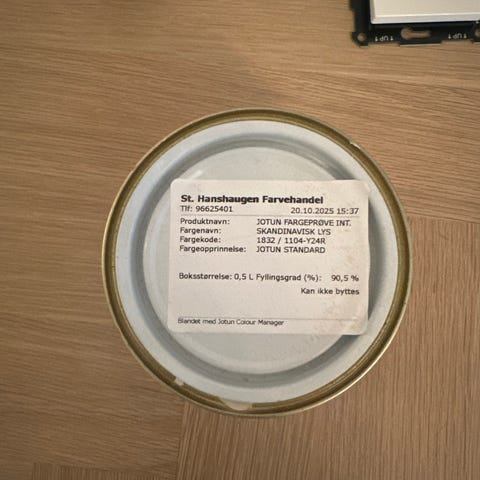 Selger fargeprøve av Jotun Sandbeige og Jotun Mohair. Under halve boksen er brukt på begge fargene. Selges for 30,- per stykk.