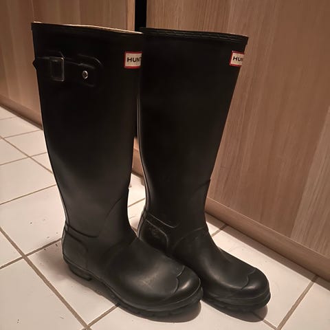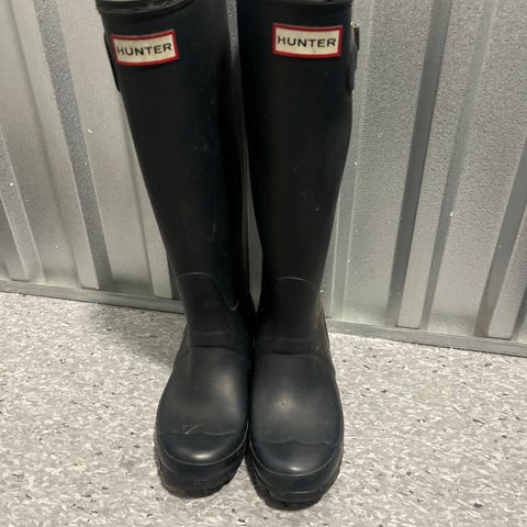 Svarte Hunter regnstøvler i størrelse 38. Godt brukt men brukes ikke lenger. Fortsatt tette og hele.