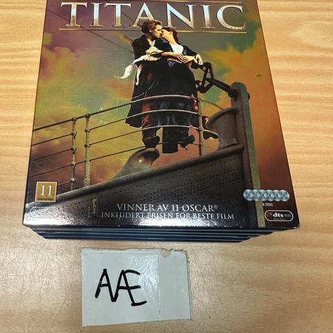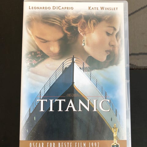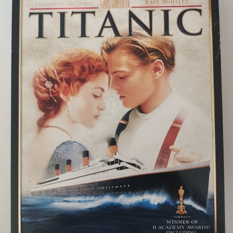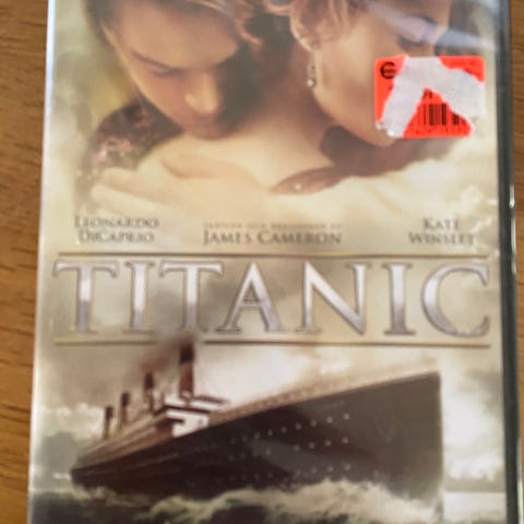 DVD-film av Titanic med Leonardo DiCaprio og Kate Winslet. Filmformat og andre tekniske detaljer ikke oppgitt.